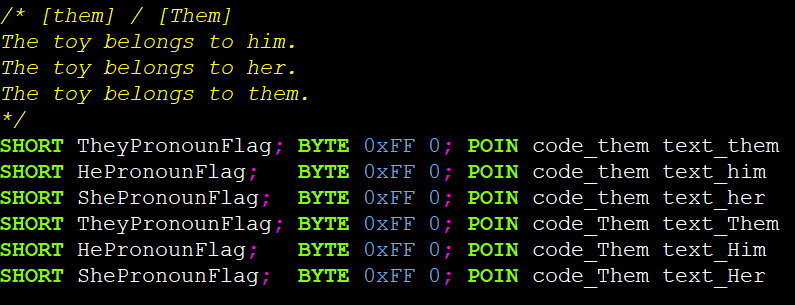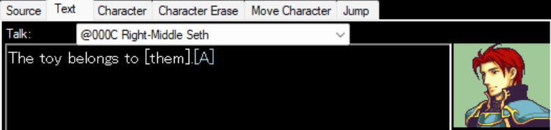 Having the #include "ReplaceText/Installer.event" line adds pronoun text control codes. (If you don’t want it, comment out this line with // and change the definitions for the flags to 0, e.g. #define TheyPronounFlag 0.)