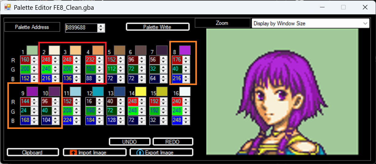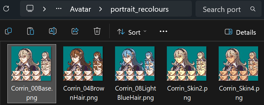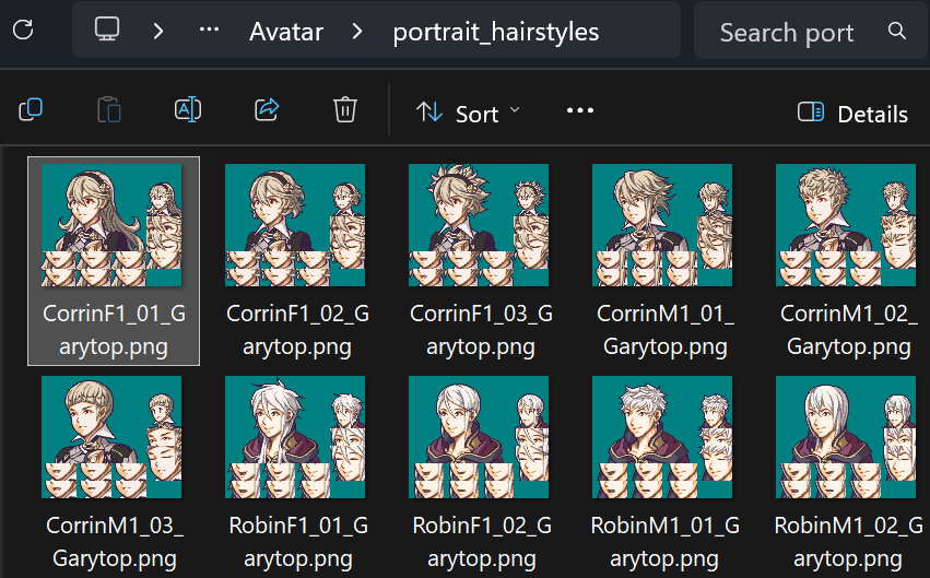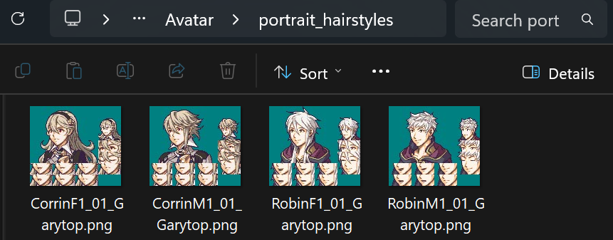 - Your avatar portraits should share the same palette order for hair and skin. E.g. If Corrin’s lightest colour of hair uses pal index 7, then Robin’s lightest hair colour also needs to be index 7.