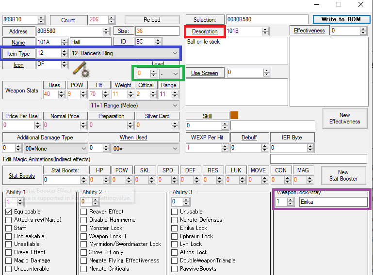 In this example, I am using slot 12 since a Flail is a heavy weapon similar to an Axe. Ignore that it says “Dancer’s Ring”. Weapon types after B really don’t matter all that much.