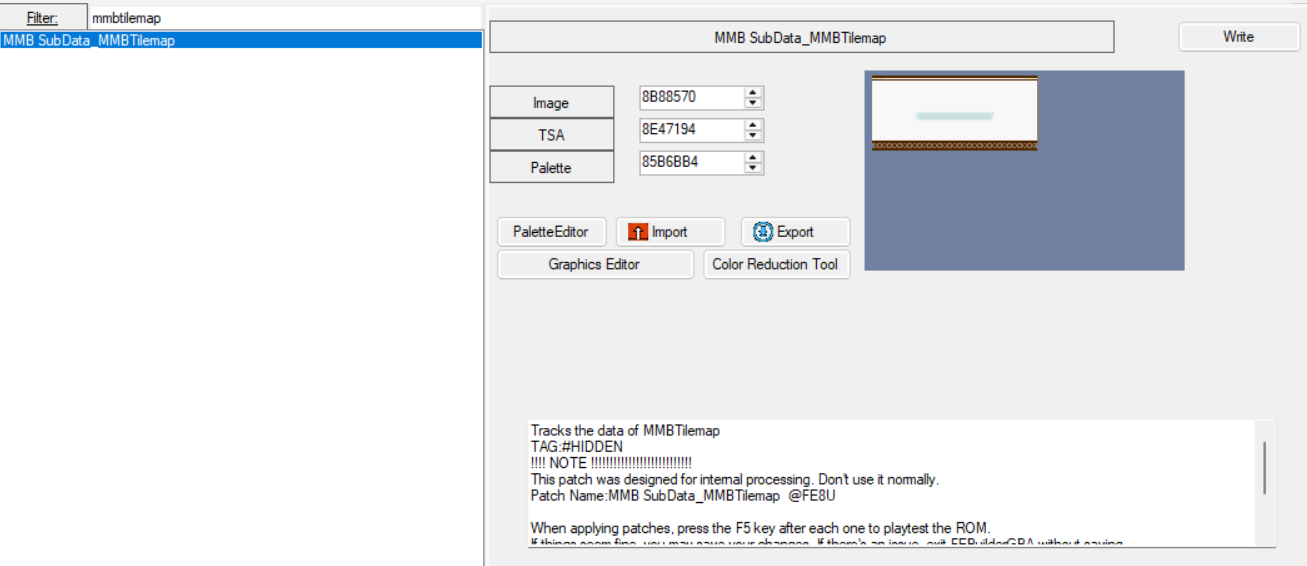 There’s one thing that uses the menu tiles that’s not included here, and that’s the minimug box, since pretty much everyone uses Modular Minimug Box. If you’re using the vanilla minimug box, the pointer for it is at 0x8C70C, it’s uncompressed, and good luck with all the people telling you to install MMB.