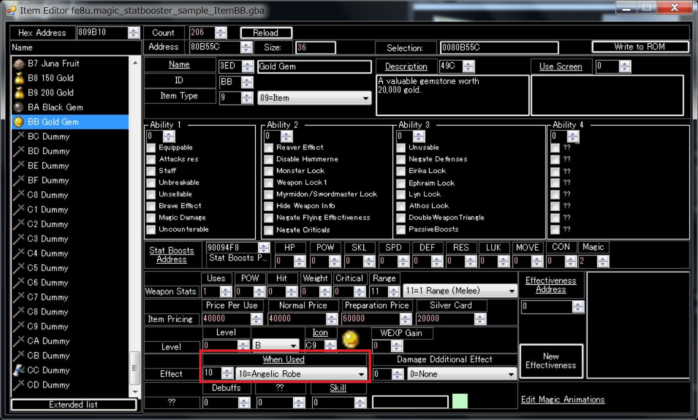 This time, change ItemID: 0xBB Gold Gem to Magic Statbooster.