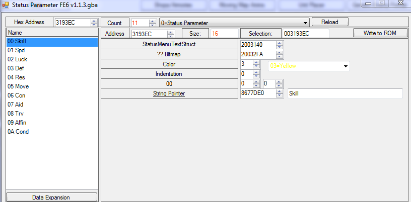 What you can see there is the picture for “personal information” with the german graphics in this case an on the right the “other texts” section. I think FE6 handled this whole thing of “HP” “LV” etc. texts seperately. You should be able to open this editor and just edit the text squares.