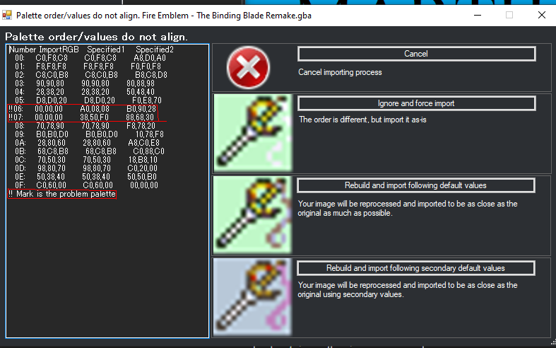 I’m trying to import a custom sword icon into a Fe8 hack, but it ends up giving me this error, and giving me options to “fix” it, but the options give colors that don’t match what I did…