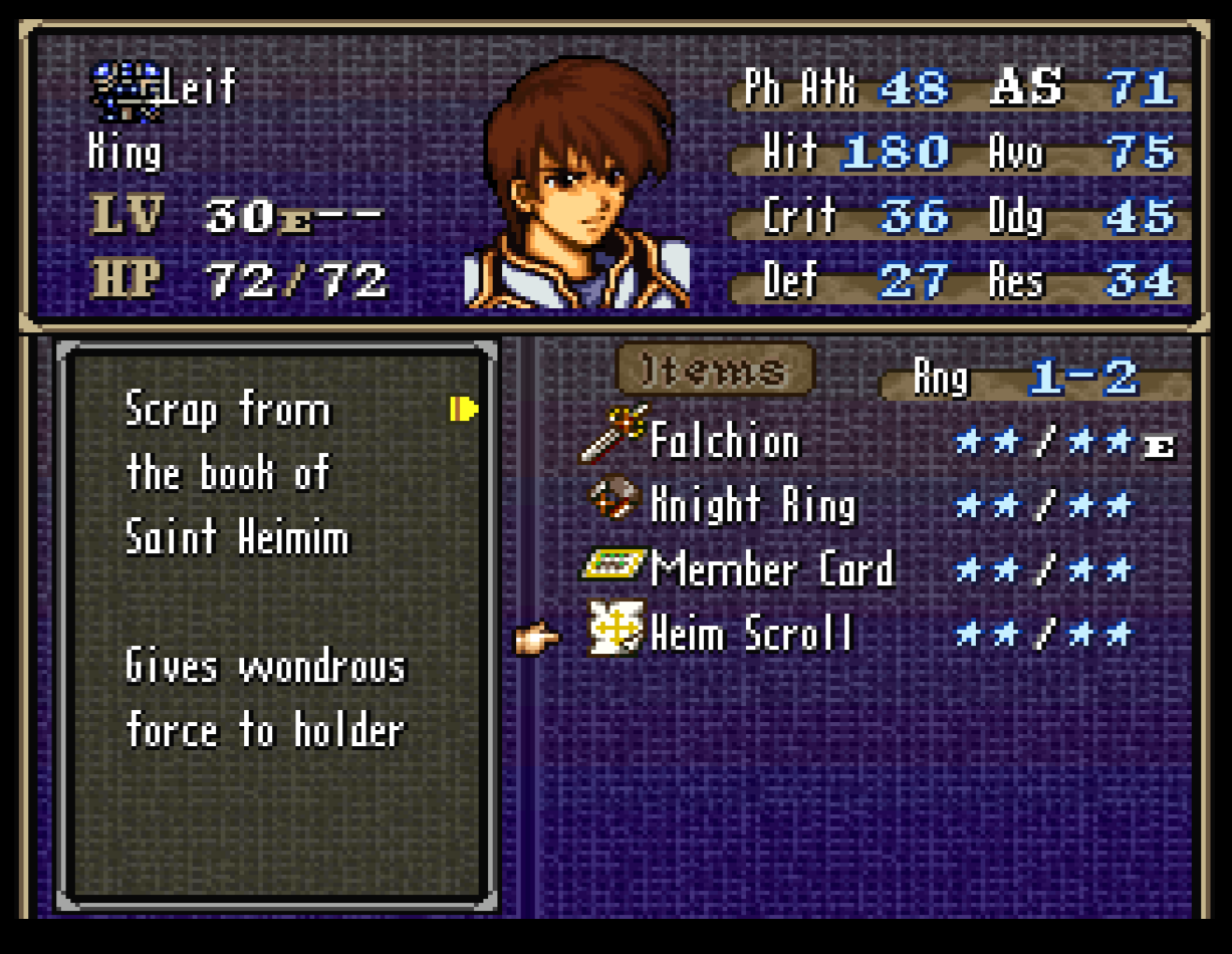 I can’t say specifically what it is because I haven’t made a list at this time, but any unit that is explicitly stated in the story line or FE4 stats as having a bit of that crusader’s blood will be able to use the corresponding sacred weapon(s).