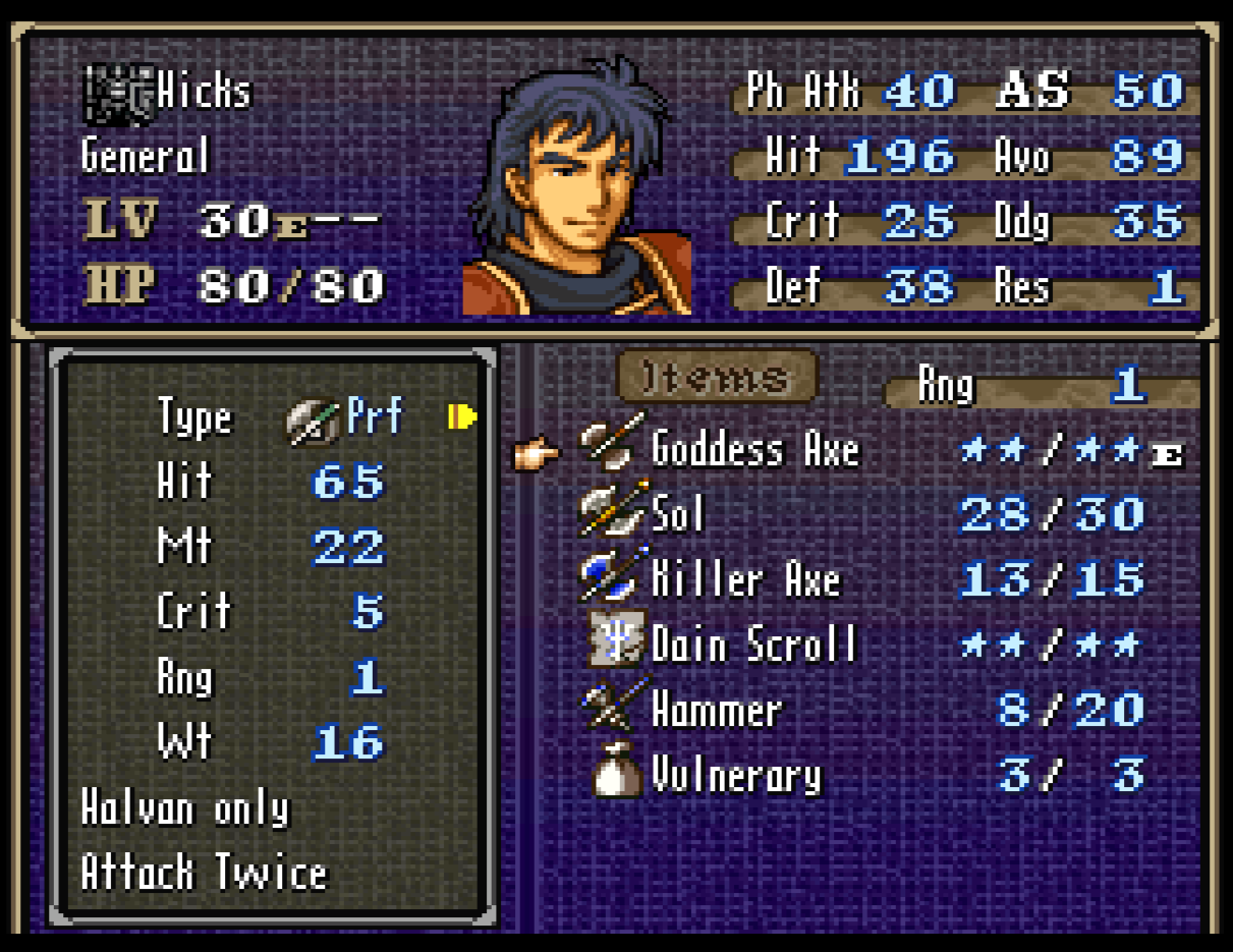As for the axe, it is the intended specification. Units with the Elite skill can equip Prf weapons freely at weapon level S. However, the sacred weapons whose weapon ranks are indicated by a star are not available for everyone to equip. I’m sure I mentioned this in the in-game guide, but if it is missing, I will add it.