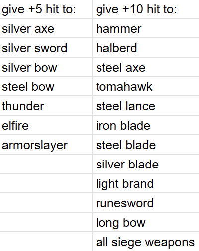 Generally, I wanted to avoid just increasing the hit rates of weapons across the board, as imperfect hit rates are a part of FE6’s identity. As such, hit rate buffs have been concentrated on the weapons that needed them, and most don’t exceed the hit rates of their iron counterparts.