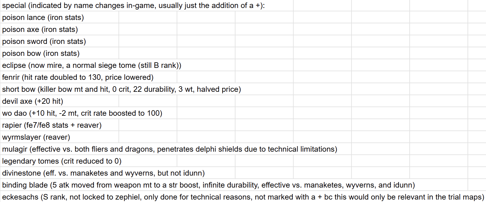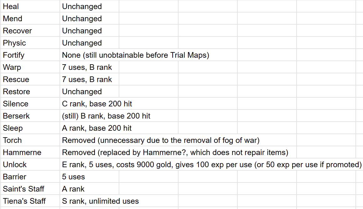To prevent units from joining with inventories full of weapons they can’t use, the weapons and staves that each unit starts with are replaced with weapons/staves of equivalent rank that that unit can use (or for weapons/staves of any usable rank if the unit can’t use any weapons of that rank- an E rank weapon in the inventory of a shaman, for example). Unlike FE8 Class Swap, these inventory adjustments are NOT malicious, although they can sometimes be cheeky.
