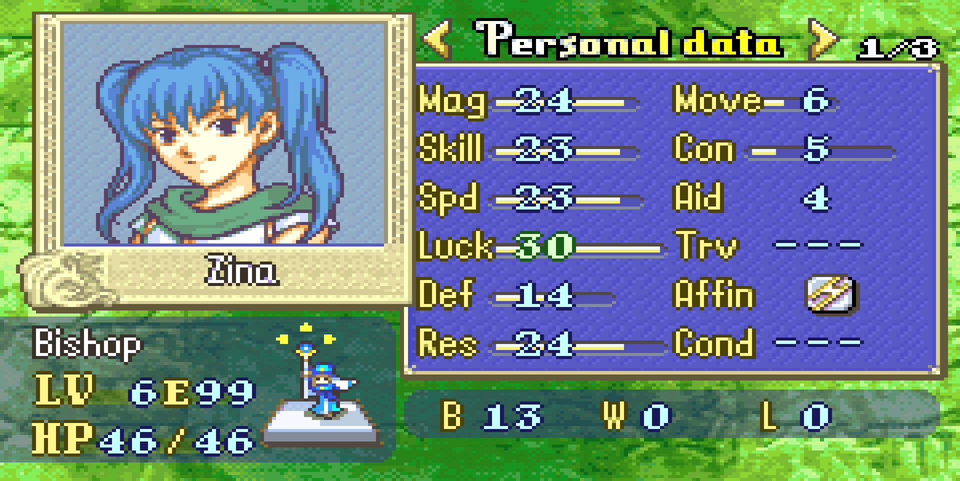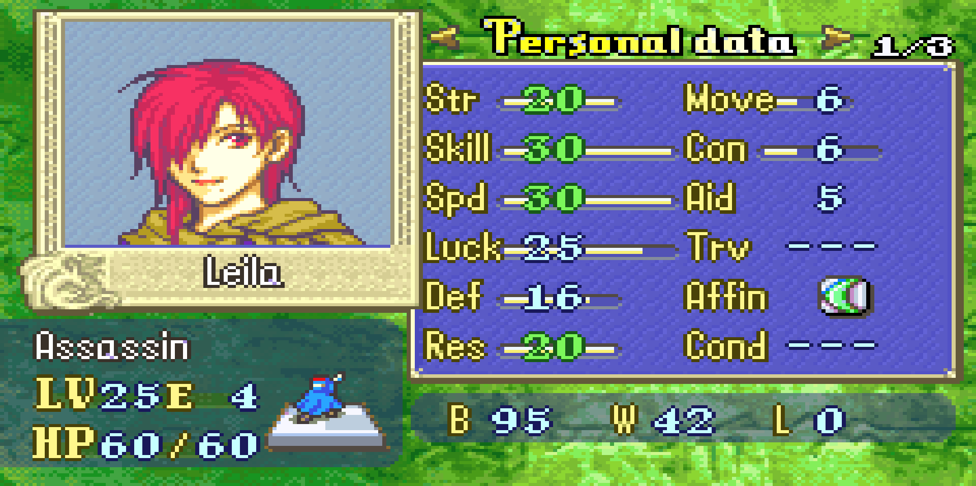Leila: Probably one of the best characters of the hack. I like her story (in FE7 with her tragic end), I like the bits of personality we see, I like the class, I LOVE that you gave assassins more crit and these Throwing knives. She was just a killing machine with very good stats everywhere.