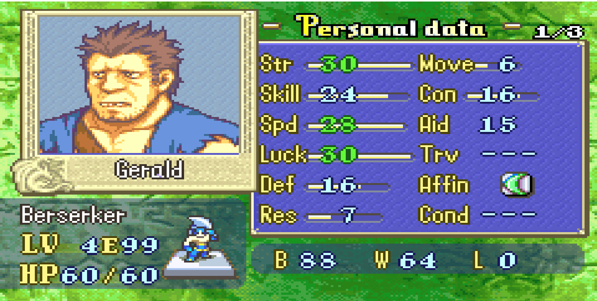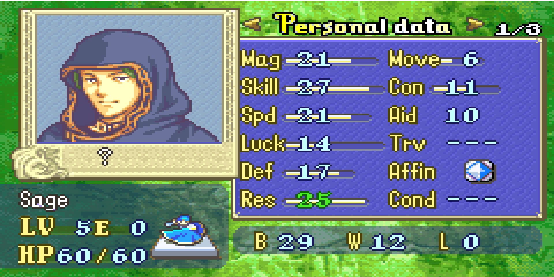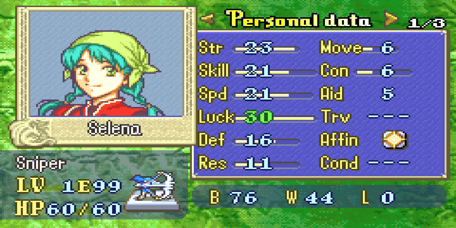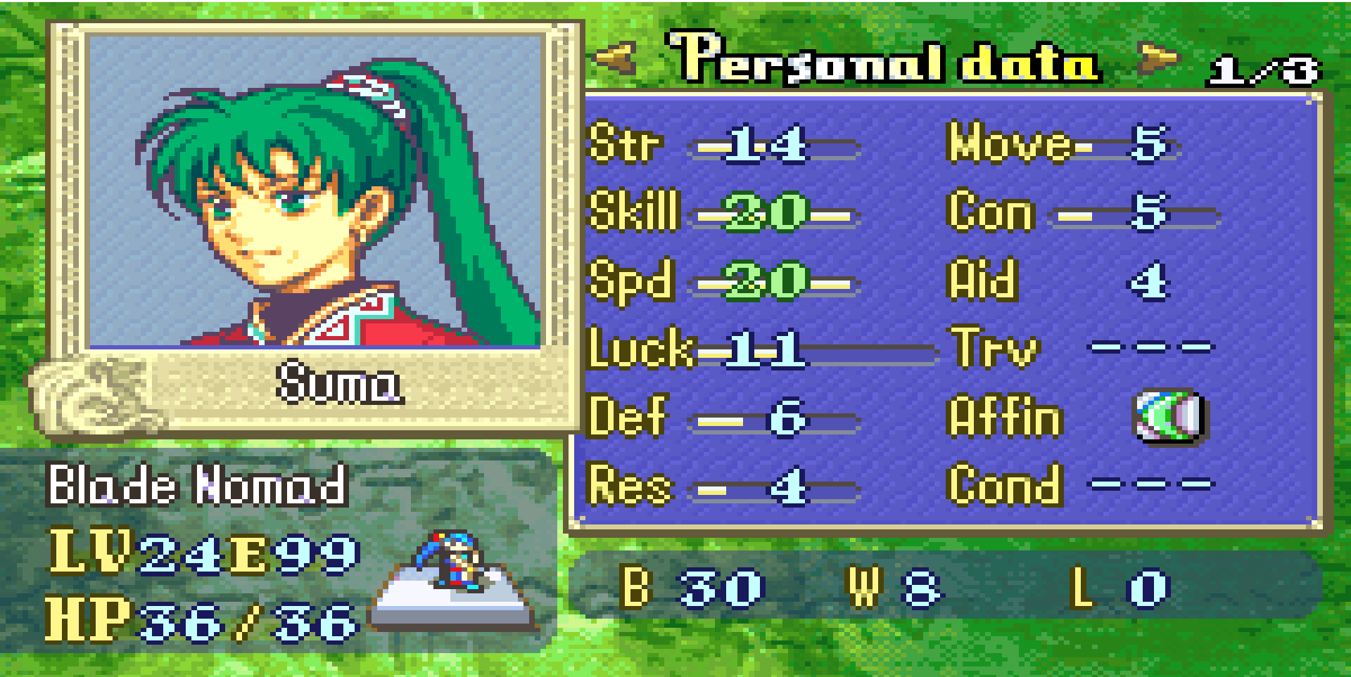 Suma: My second favorite character of the hack. She’s just like Lyn, not very easy to use pre-promote, but has good crits and okay stats. However, when promoted, with a lot of speed and a bow, she becomes unkillable and just crits everything.