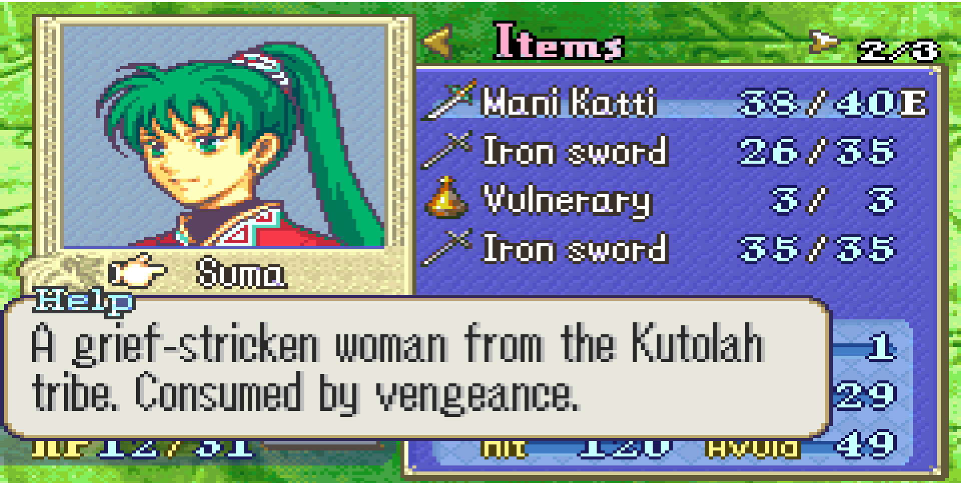 I am not in favor of using Lyn’s Original Portrait Edited for someone else who is not related to her. Suma also wield the Mani Katti. You will have to explain to me how she got a hold of that sword and how that sword ended up in the shrine in FE7 later on.