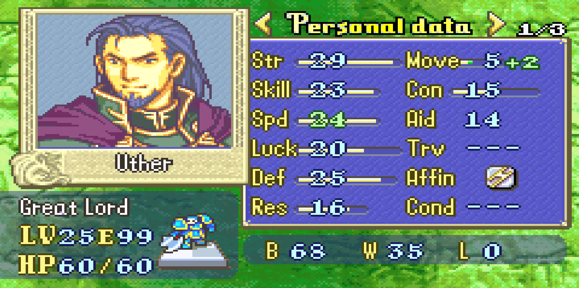 Uther isn’t there cause these screenshots are taken after the epilogue. He was a good unit overall but severely lacked speed and became very weak because of that. He didn’t have much defence to overcome that. Good character but not my favorite to play, the others were better. Maybe I was just unlucky with his stats.