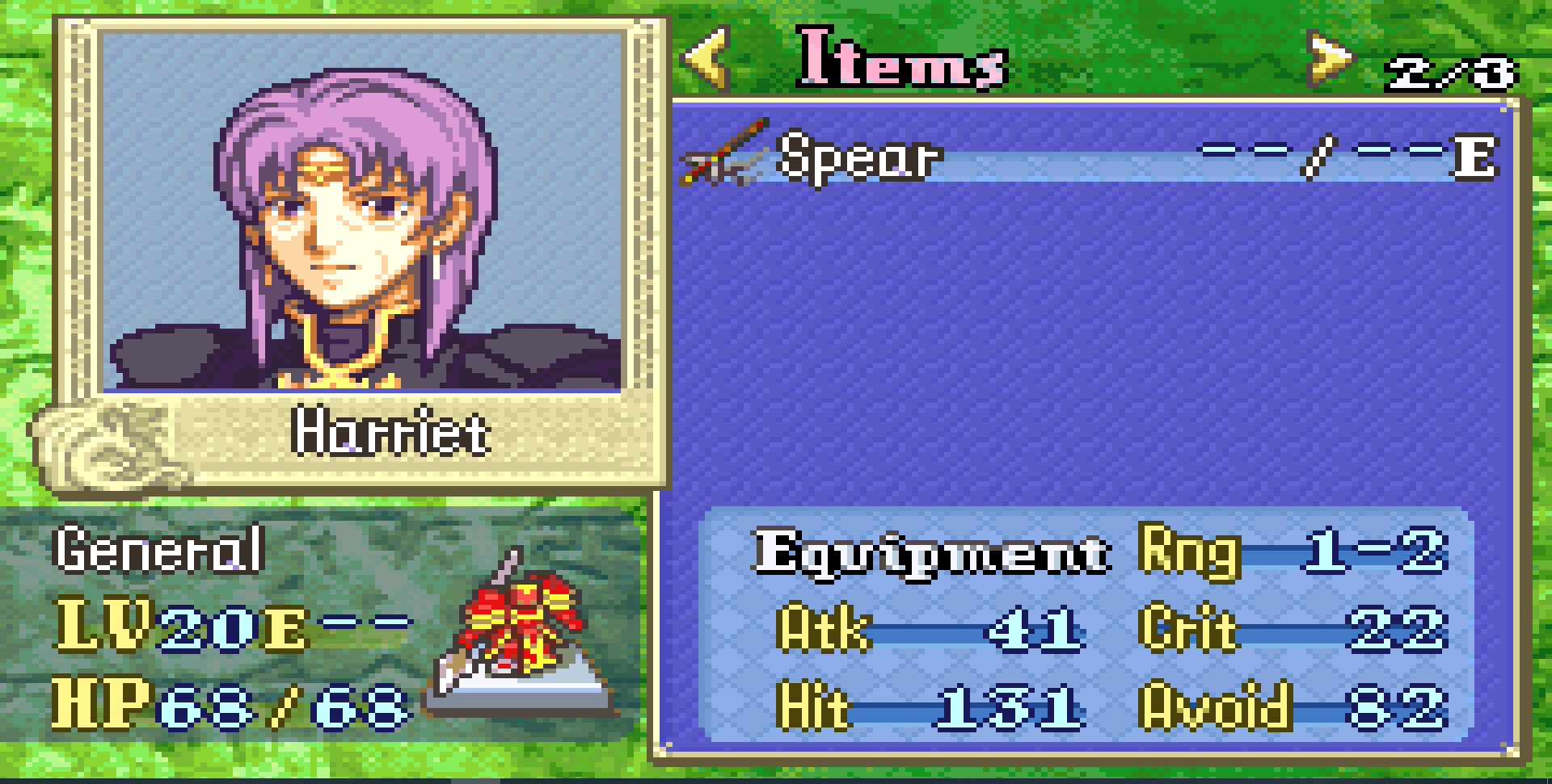 Malissa: One of my favorite units. Thank you so much for reducing the weight of Dark tomes and increasing the number of uses of Nosferatu. She was so good, could have completed entire chapters by herself. 10/10