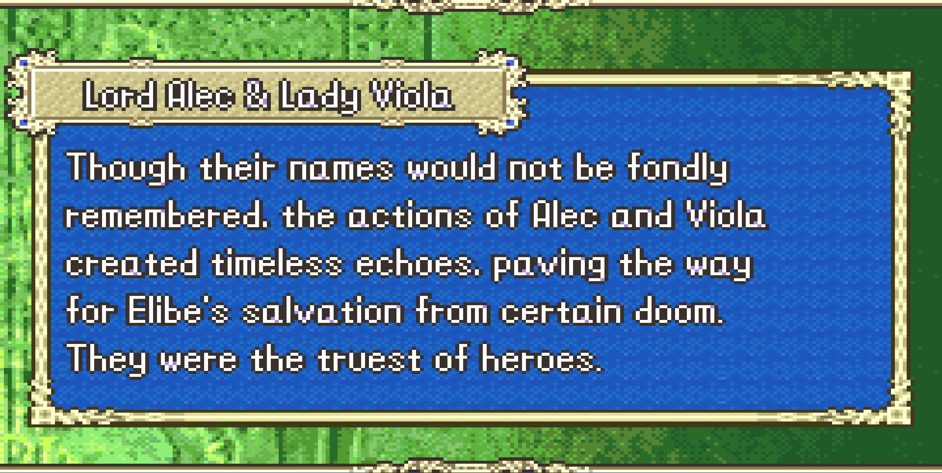 At risk of coming across as comedic, I refer you to the hack’s title. Further, I expect the player to be accustomed to the fate of the Cornwells, and with that in mind I would not expect anyone to start the hack with the intention of getting an all-around feel good-story. Though I would like to point out that the acts of saving Eliwood, Lyndis and many others throughout the story should act as rewards/points of relief for the player, as you get the sense that fighting for a good cause, despite the many struggles, is worthwhile. (The epilogue text on Alec and Viola comes to mind.)