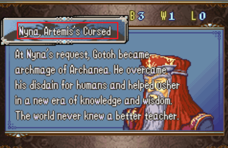 nyna as a gameplay unit in the context of this game is either incredibly busted, or all the other mages are meh (but really i think it’s both). 12 mag 16 speed on join is huge when she barely joins like right after linde (level 1 mage) and boah (SD bases lmao) and straight up outclasses both by a significant margin (especially boah). i have practically not felt a need to use any other mage because nyna just joins at the perfect timing to do stuff, has weapon rank for everything except like bolting (oh look thoron tome in chapter 15 just to feed her anima wexp!!) and gets to use like basically every single relevant light/anima tome outside of aura and excalibur. meredith technically exists for dark access but when flux is like the only available dark tome for most of the game it’s a “yeah whatever idc” moment. nyna is also the perfect cheese against everybody’s favorite superboss camus because his AI will not target nyna period. speaking of camus…