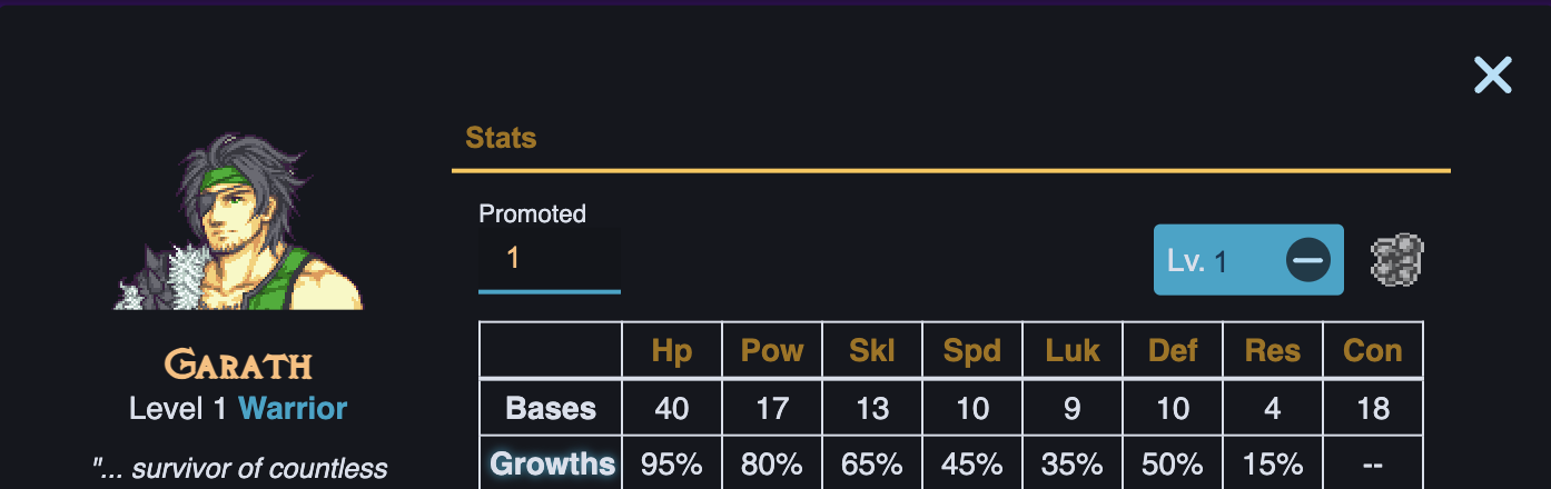 Fallingoffsayswhat. Gareth has been an excellent unit even long after his speed stopped cutting it. Longbow access (and Greatbow specifically) are so centralizing that I chose him over Corbeau as my Warrior prepromote despite the latter’s better stats in every area. With supports from Rena and Kolbane he was still able to OHKO problematic mages from 3 range, notably Severin in 12A.