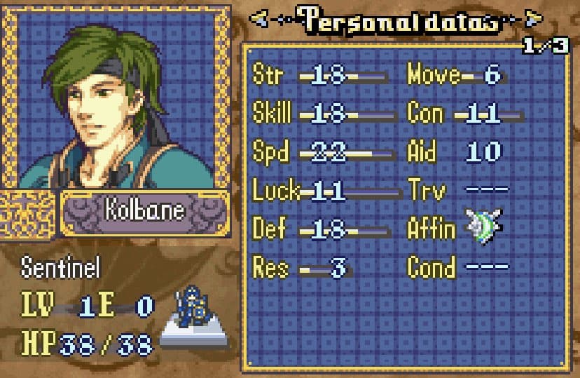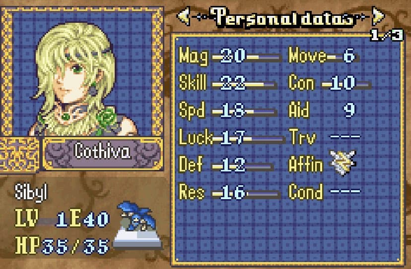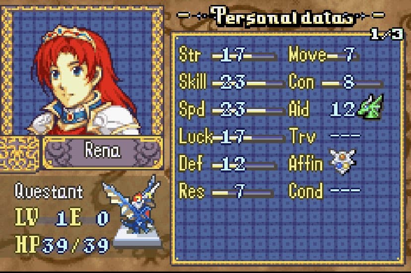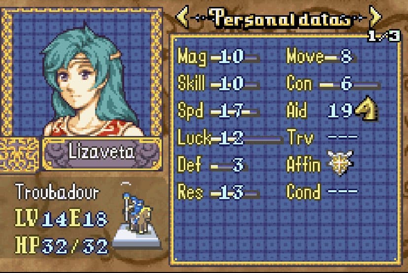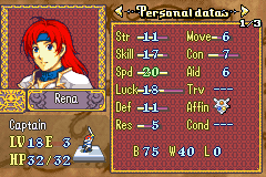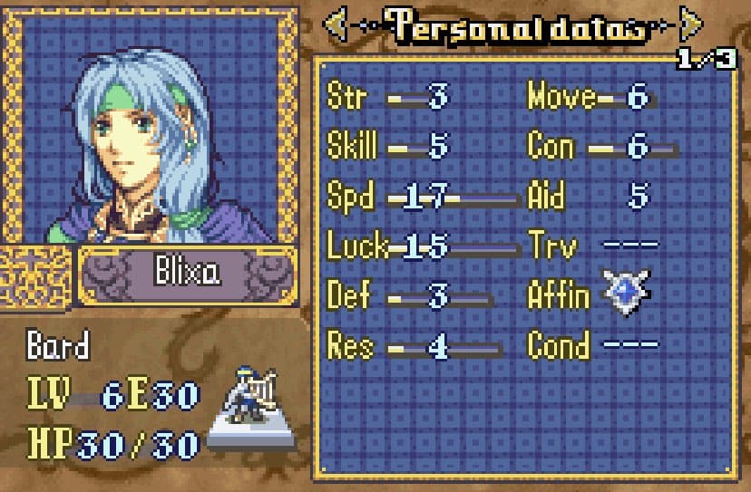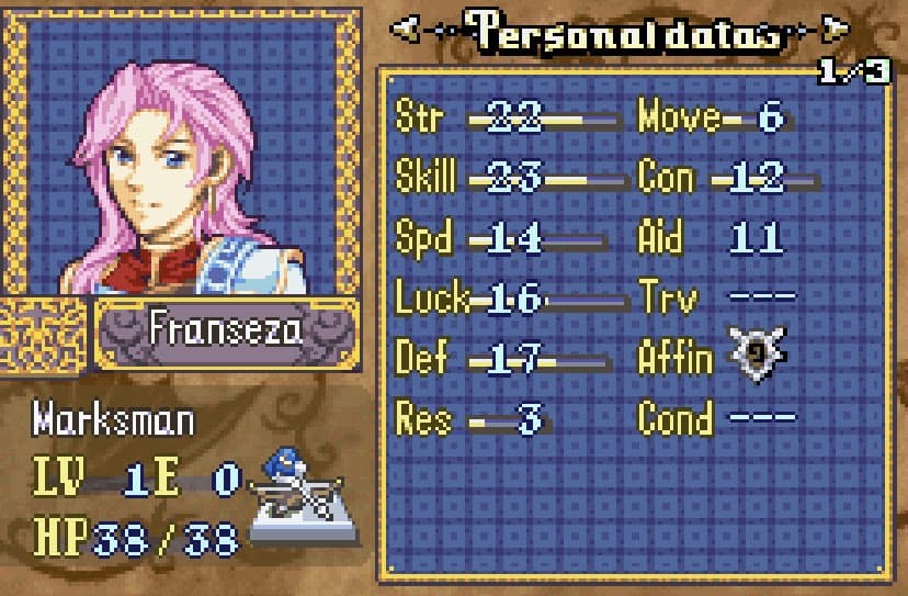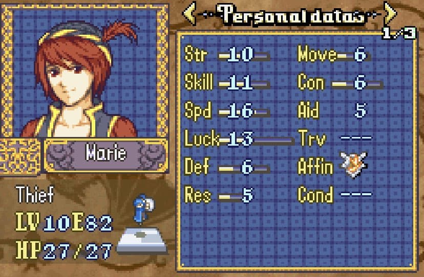 She thiefs. Outclasses Chester and does okay enough in combat when you need her, but goddamn she must be tired for how much she has to run around on the later Musain maps with their chests and doors all over the place, and keys basically being non-existent. I’d seriously recommend adding more unless you want the player to either master rescue chains or bring 2 thieves.
