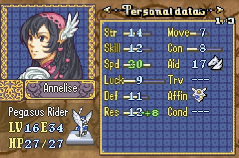 Annalise is probably the only unit in the game who actually benefits from the Warding Sword because it bumps up her passable resistance to great resistance. Aside from that she does normal pegasus knight things, she’ll probably get the +2 strength consumable once I get over my statbooster hoarding.