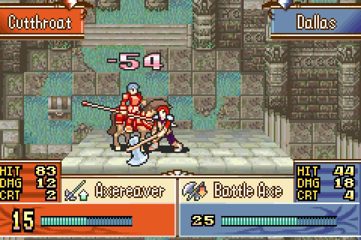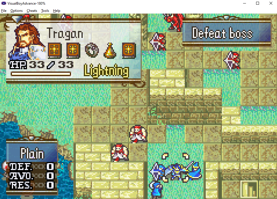 Boss having +20 crit is a new skill to me, but also scary. Made trainee into wyvern, benched archer to field thief. 7 mov brigand is cool, spur speed on mage is a bigger deal to me though. Boss having listed mov instead of – implied he’d move, time limiting the map. Range 1-2 and crit on miniboss is scary. Risked 8% crit and used a heal to kill them. By end of turn 8 only cyclops and boss were left, I couldn’t kill cyclops without using another heal at this point and some xp with poor growths didn’t seem worth it.