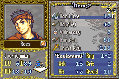 Started a separate save file, and found that The Axeās curse has spread to other items, somehow. A Chest Key in Ch. 3 ended up having 219 uses when Ross defeated the enemy holding it with a Hand Axe.