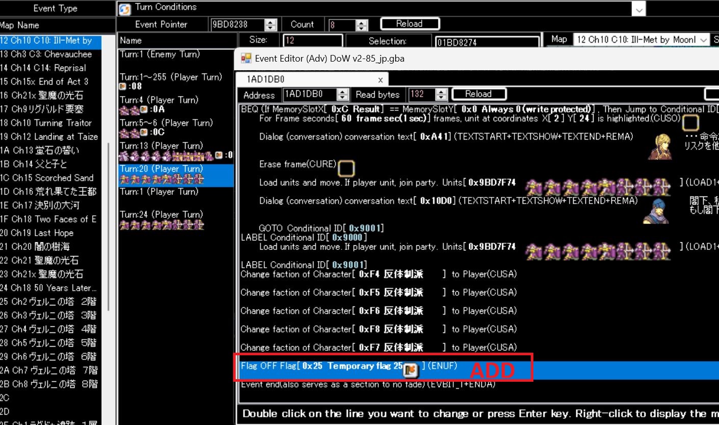 In C10, if a player stalls for 20 turns, all civilians become “Player” units, but Flag 0x25 remains ON. This makes it impossible to escape even if you open the gates. I recommend turning off Flag 0x25 during the event where civilians turn into player units on turn 20.
