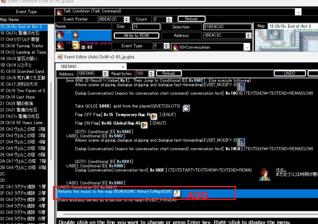 In the scene where Paoletta is hired for 5000G, the BGM does not return to the map theme. You might need to add the “ASMC ReturnToMapBGM” command at the end of the event.