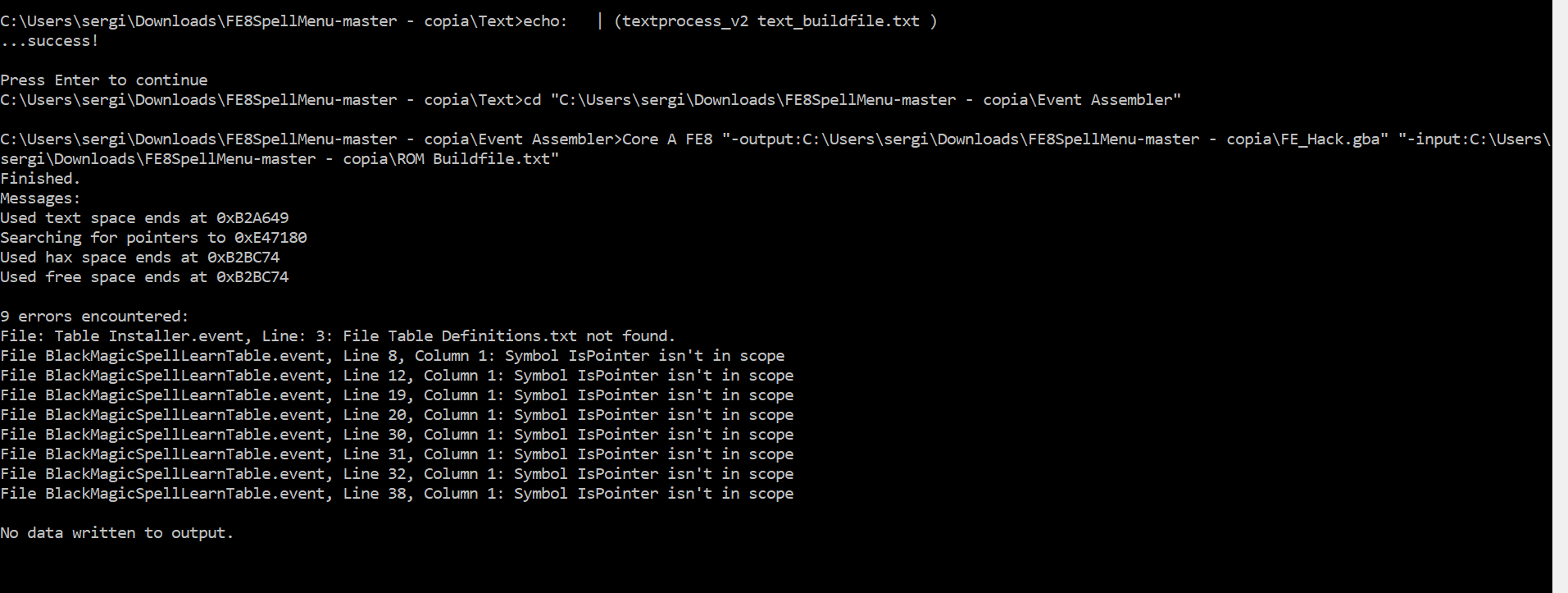 Oops, I forgot to include a file with some of the table helpers. Here’s a replacement - place it in your “Tables” folder: https://github.com/SpaceToastCoastToCoast/FE8SpellMenu/blob/master/Tables/Table%20Definitions.txt