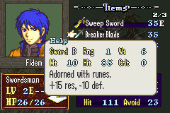 Zelix: iron sword runesword, killing edge, silver sword, fortify, Killer axe, Luster & Dew, fang stone, vulnerary, elixir, angelic robe, energy drop, secret book, speedwing, goddess icon, dragonshield, talisman, boot, second seal, vanguard brand, killer lance