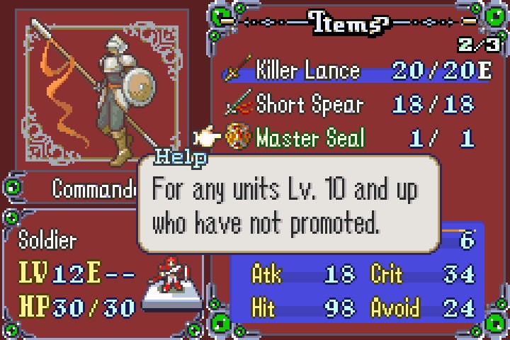 So that was it, as I was readying myself to farm the flier reinforcements as long as I could I saw another glimmer of hope, I deployed Bandit 2. That was it, it was perfect, I just had another master seal in my convoy, and after he reaches level 10 by grinding infinite fliers he could promote to zerker, waterwalk across the sea, and destroy the last fort. Before promoting him I gave him everything he needed to make that journey, all of the concoctions and yep… he promotes to warrior…