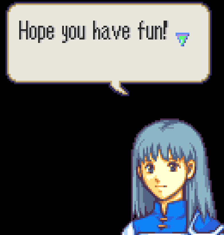 A little about the hack itself: I want to try and work on this with zero pressure. Expect it to be a little on the sillier end in-terms of writing! I originally wanted players to headcanon whatever they wanted onto the units, but as stated earlier, I got a little attached to the project and decided to try my hand at writing what personalities I projected onto ‘em. Regardless, I still encourage my playerbase to have fun in whatever areas I’ve yet to touch upon. After all, suggestions from friends helped shape a few established plotpoints. That makes the journey all the more satisfying!