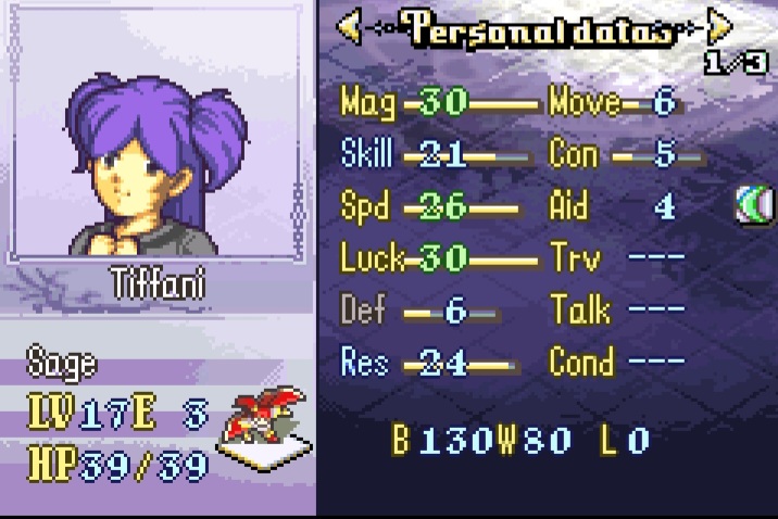 Tiffani isnt too hard to train and with the amount of magic and speed she gets it made it very worth training her, only issue like lyon is not much defense and unlike lyon she doesnt have nosferatu. Unlike lyon though shes probably not getting doubled due to high speed-