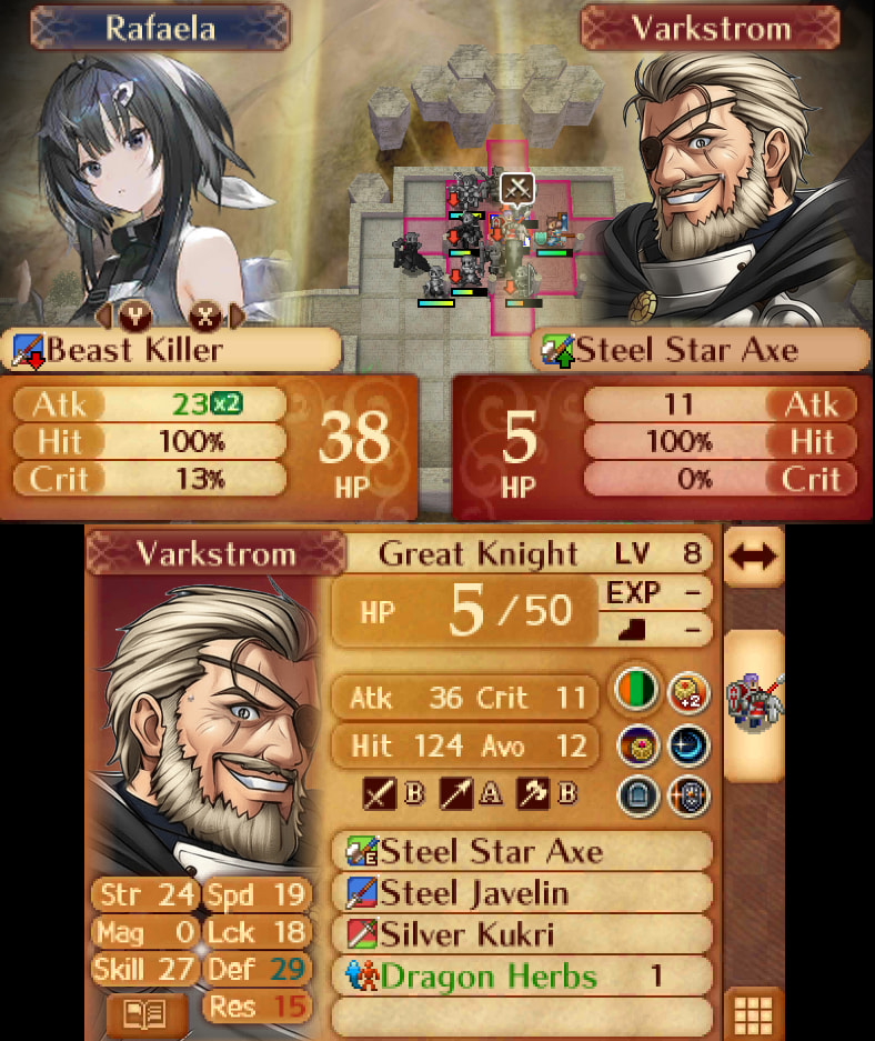 Varkstrom isn’t that threatening of an enemy, since he only hits for 36 damage max without weapon triangle advantage. He might have Armor Shield, but he doesn’t have Beast Shield!