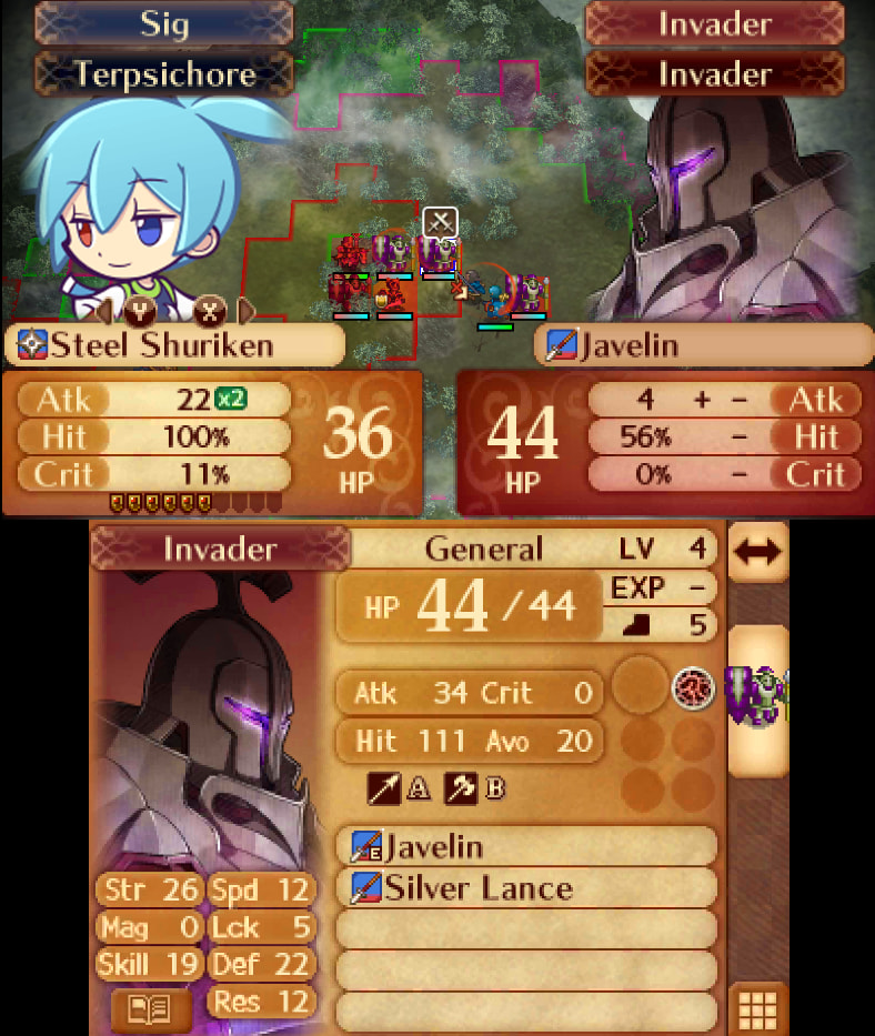 Sig is still MVP for taking out maybe 1/3 of the entire map, notably all the enemy mages on the right side. With Rally STR, he can even take out Generals without Wary Fighter. Funnily enough, one of the Snipers at the beginning dodged two listed 97%s, which is absurdly (un)lucky, considering hit rates above 50% are weighted lmao