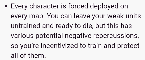 (other games, such as Bound Destiny make most unit deaths a game over condition in favor of pushing a tight-knit narrative, and Dark Amulet makes certain units [up to 10+ at once, or half your cast early game] a game over condition)