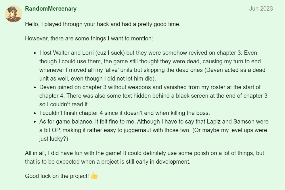 Making a thread in the server is always scary. I don’t know how the public would receive the game I made, the story I wrote, and the experience I wish to display to a general public. So… after many nervous pacing on an April Afternoon… I decided to post the first beta test of Visions of Liberation which spanned from Chapters 0-3. At first I was just constantly refreshing to see if people reacted already to what I cooked. Then turned into the sinking feeling that I was sure nobody was interested in the game… and then… a literal random mercenary commented at my work and that was all I need to see one morning.