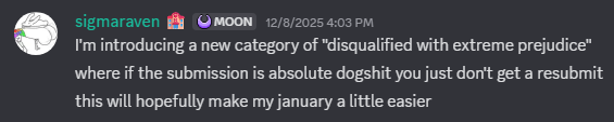 This does not disqualify any currently passing entries, but it will hopefully make you all clench a little.