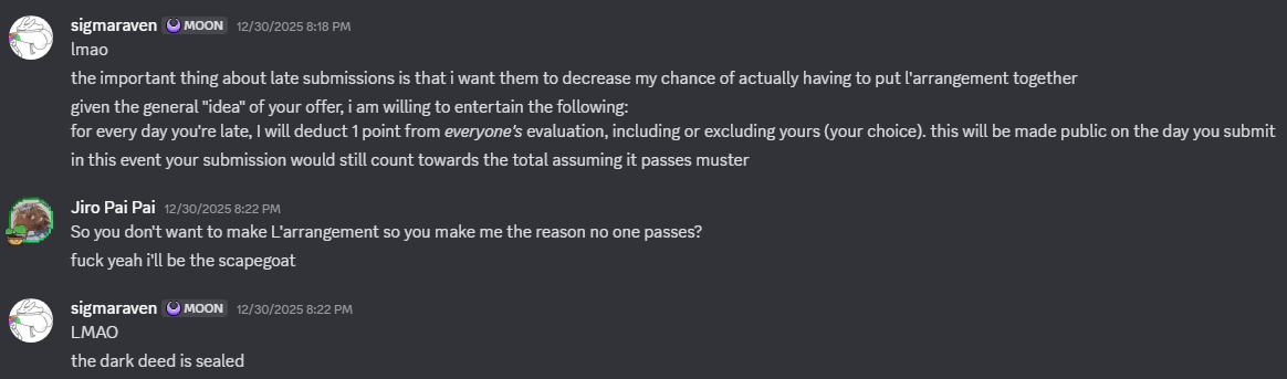 As part of a dark pact struck with Jiro, every entry will have 4 points deducted from its final score.