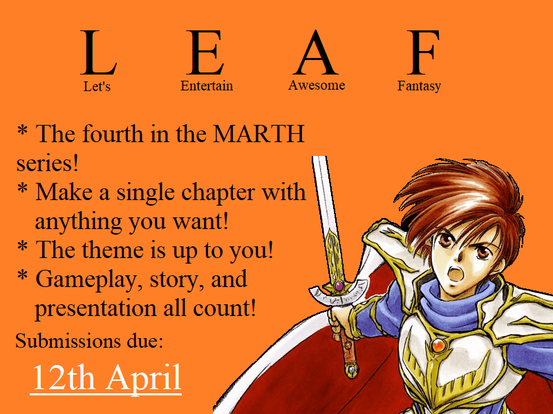 Announcing the fourth in the series started by MARTH: the Let’s Entertain Awesome Fantasy contest, or LEAF. You can call it the Let’s Entertain Intriguing Fantasy contest, LEIF, too. This is a chapter creation competition in the vein of Ghast and Alusq’s Make A Fun Chapter series. This is intended to be a basic, no-frills contest. Prospective entrants will be challenged to make a quality chapter based on three fields of skill: gameplay, presentation, and story.