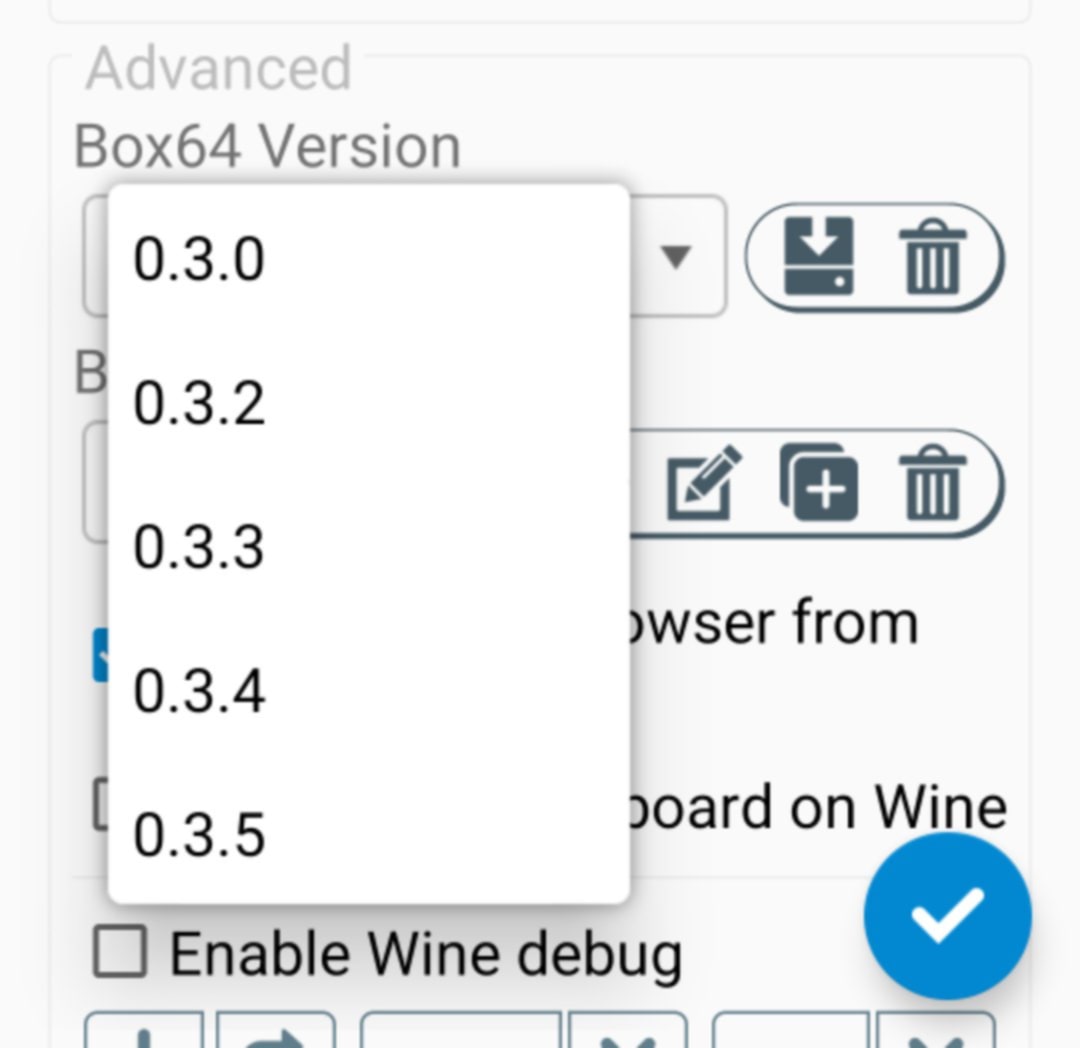 Go down to Box64 Version and select 0.3.0. Press the check button.