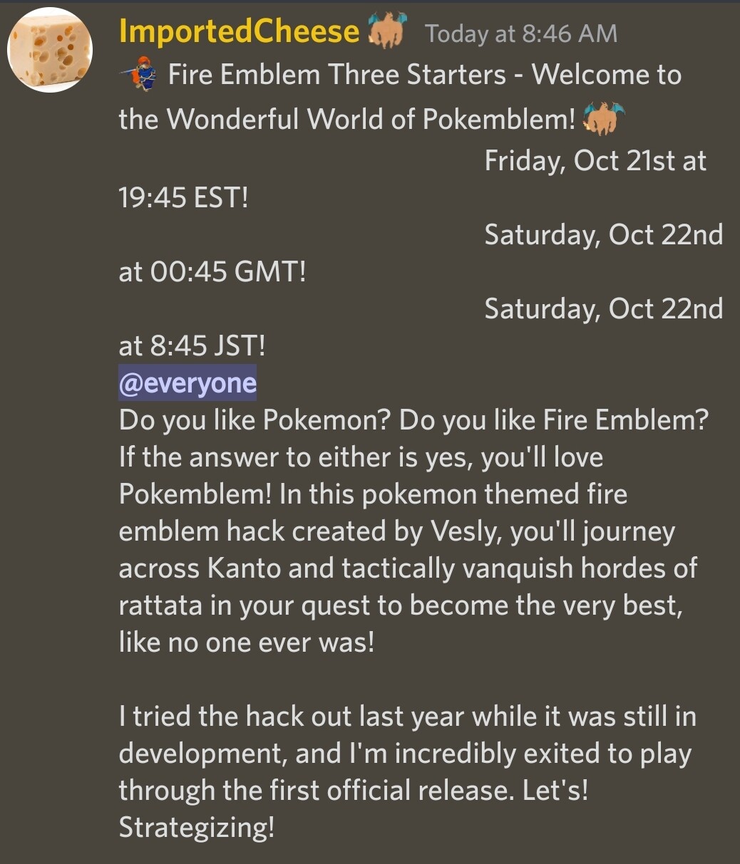 Imported Cheese has kindly asked to stream Pokemblem for its v1.00 release tomorrow after my FEE3 video comes out.