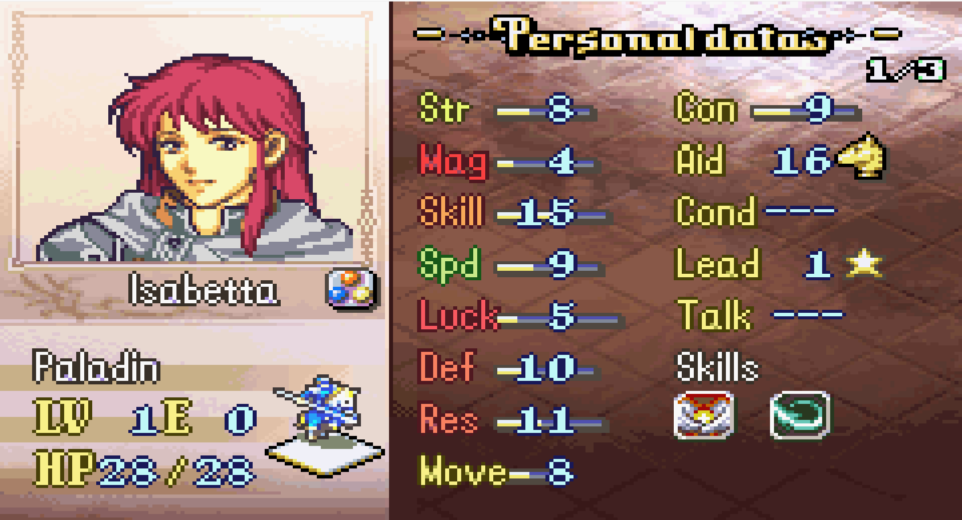 this romhacks include the Skill System, Str/mag split, a couple of new classes
