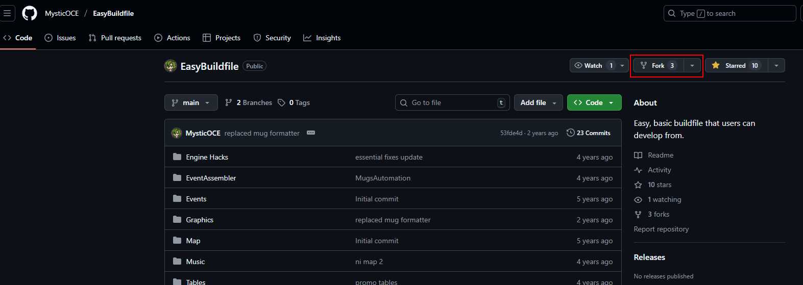 If you do not have a buildfile yet but want to work off of someone else’s template, there is a much easier method than the above for doing so. On GitHub, when you’re logged in and looking at someone else’s repository, there should be a Fork button, as so: