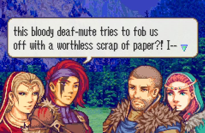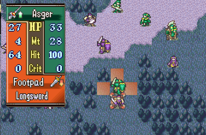 Nothing all that original, and I think it’s pretty clearly influenced by having just played Vision Quest at the time (though not wholly; actually, the 2012 version of Drums of War was meant to have split parties. Good luck with that on FEditor…). Certainly hearing about the convoy split was the kind of thing that made me think, hey, I should make a game around the convoy split. So I tried to make a SkillSys custom build, failed, tried again, succeeded, and then pretty much didn’t touch that version of the ROM ever again.
