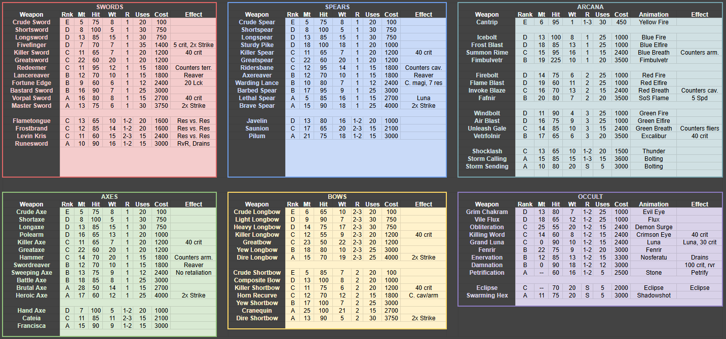 Something I’m considering is having almost no free drops of weapons, outside of things like legendary weapons or non-ransom units coming with a workable kit (and, of course, not having many non-ransom units to lean into it from the other end). Also, maybe lower durability largely across the board. All about making the player make calls, breaking weapons through use, etc.