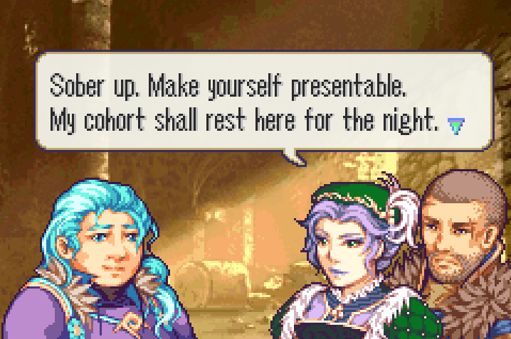 Of course, this is far from novel. It’s quite routine in, for example, an RPG, to have some sort of ‘home base’ you keep coming back to, where you can chat up your companions. They’re in just about every Bioware RPG from Neverwinter Nights on, for a start, if not earlier. I’m in two minds about these. I feel they do create pacing issues. I’ll use Dragon Age Inquisition for my example, but it’s far from alone; often you get your base and your opportunity to talk to your companions, but that winds up being… here, have 18 dialogue trees to exhaust, with them all helldumping their backstories onto you, their thoughts on the current situation… worthwhile in isolation, but taken on aggregate? You wound up getting lost in it. And, sure, they’d update eventually… so what does that mean, keep going back to check every time anything happens? I’ll do that for Sandra in Pyre, but nobody else… or, well, if I do, I’m checking boxes, not paying attention. My Trevelyan sleepwalked her way into fucking Josephine, but I can’t really say I remember at all who she was or what she was like, besides ‘polished’ and ‘available’. And this is all one thing in an RPG where talking to people is the main draw of the game, but in an FE, it’s really meant to be more of a garnish.