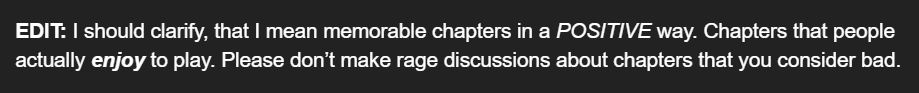 Chapter 5x → The first time I played this game, I found it really cool that I would be controlling someone outside my main group (I REALLY enjoyed shifitng POV stories and games when I was younger - still do now). It also helps that the gameplay feels perfectly balanced, and that Ephraim’s plan is so unbelievably genius. The fact that we don’t find out what happened until Chapter 8 is also very clever, imo;
