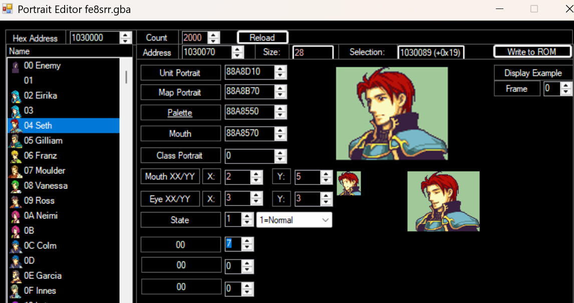 There are 8 tone samples included, with 4 pitches for each that it randomizes between. Tana is using the default tone (0, which is identical to 5). They range from highest in pitch (1) to lowest in pitch (8). Here I set Eirika to 2 and Seth to 7 by editing this padding byte in the portrait editor.