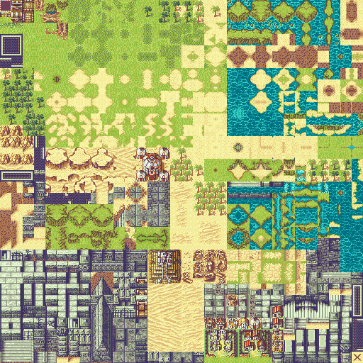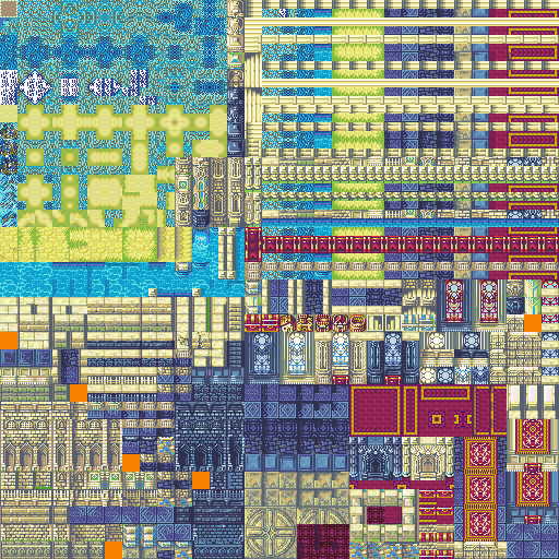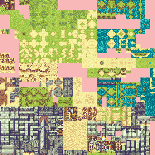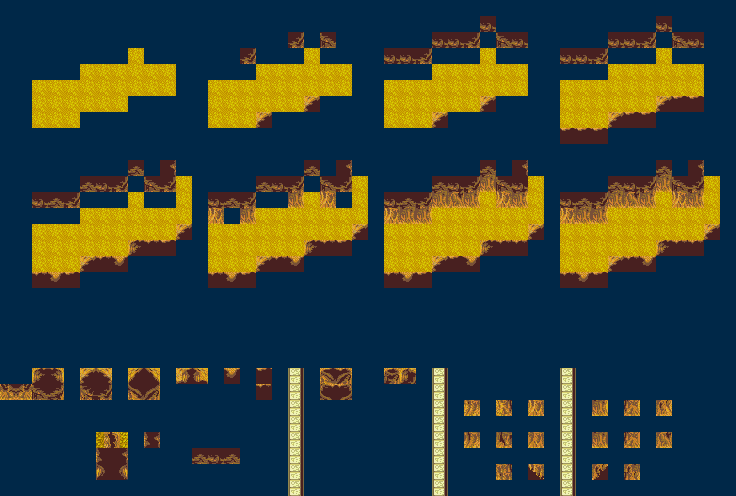 On the far left are the standard wall tiles - think of them as the cliff to water tiles along the edge of an island. It’s fairly easy to tell which section is which, but the furthest right of this bunch is the top line surrounding each island, the lower left tiles are used for the left and right walls in case a cave is vertical, and the bottom right section of here is the lower rim.